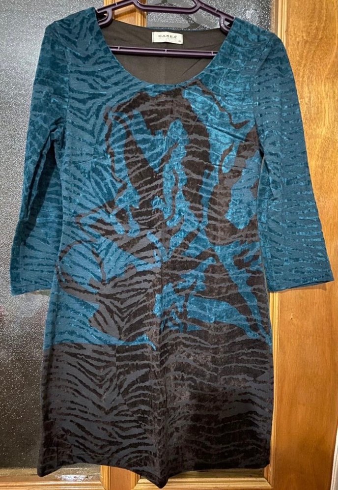 Uzun kollu, bisiklet yaka, drapeli, koyu turkuaz tonlarında desenli, bohem tarzda
