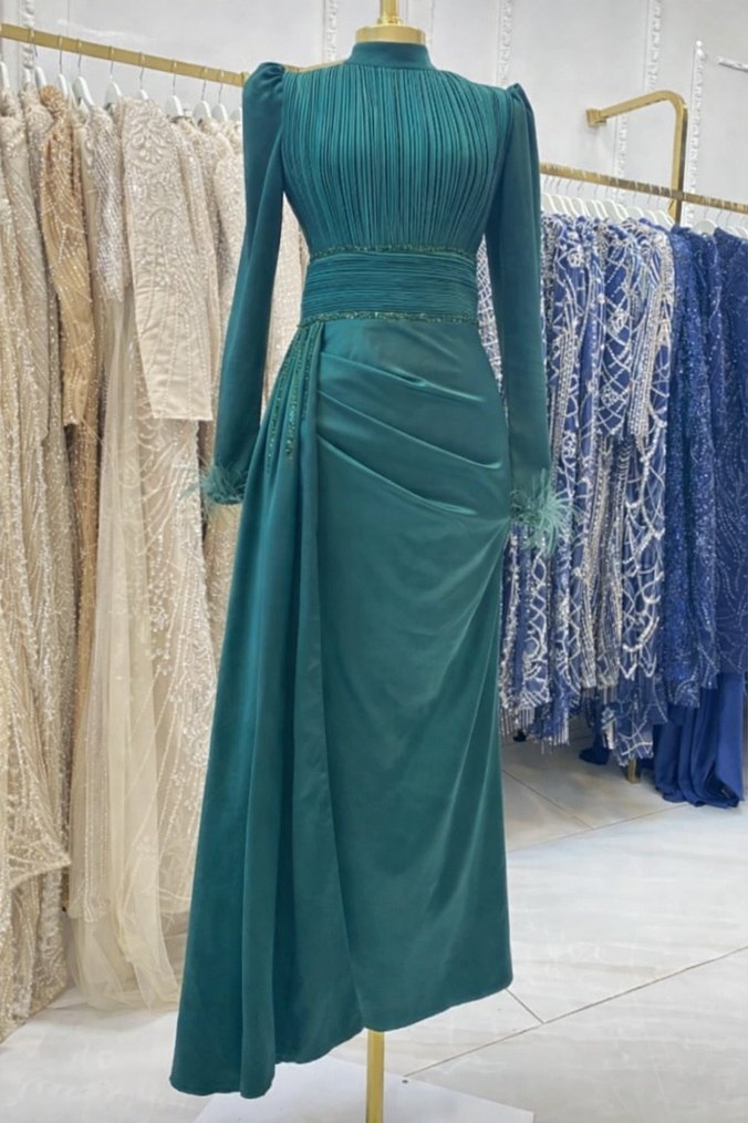 Uzun kollu, yüksek yakalı turkuaz abiye elbise, drape ve nakış detaylarıyla vintage esintili, parlak görünüme sahip klasik şıklık sunar.