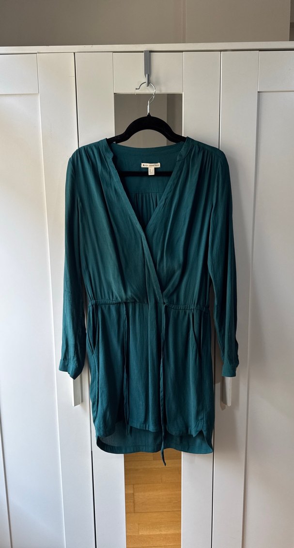Uzun kollu, V yaka ve drapeli tasarıma turkuaz renkli, bol kesim, rahat ve şık.