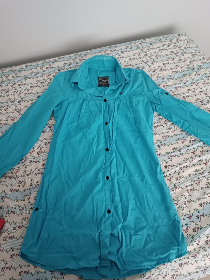 Uzun boylu, turkuaz renkli gömlek, yakalı ve düğmeli ön kısmı ile dikkat çeker. Rahat kesimi ve yumuşak sentetik kumaşıyla günlük sokak stili için uygundur.