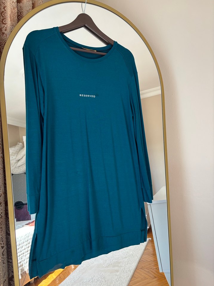 Uzun kollu, yuvarlak yakalı, bol kesim normal tunik, koyu turkuaz ve ipeksi kumaştan. Günlük kullanıma uygun, rahat ve şık bir model.