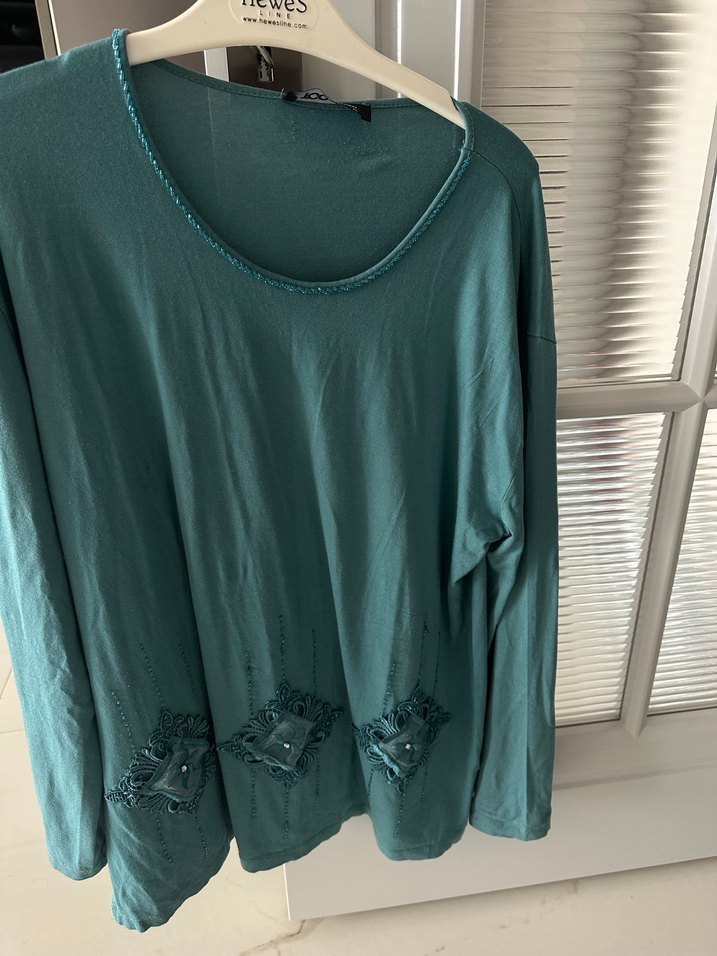Uzun kollu, yuvarlak yaka, bol kesim turkuaz bluz. İşlemeli detayları ve parlak dokusu ile bohem tarzını yansıtır.