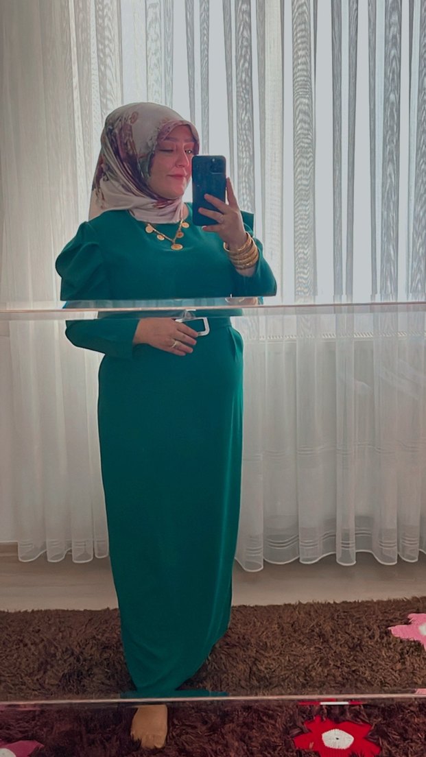 Uzun, turkuaz renkli elbise yüksek yakalı ve uzun kolludur. Drapeli tasarımı ve regular kesimiyle, ipeksi kumaştan üretilmiştir. Günlük kullanıma uygundur.