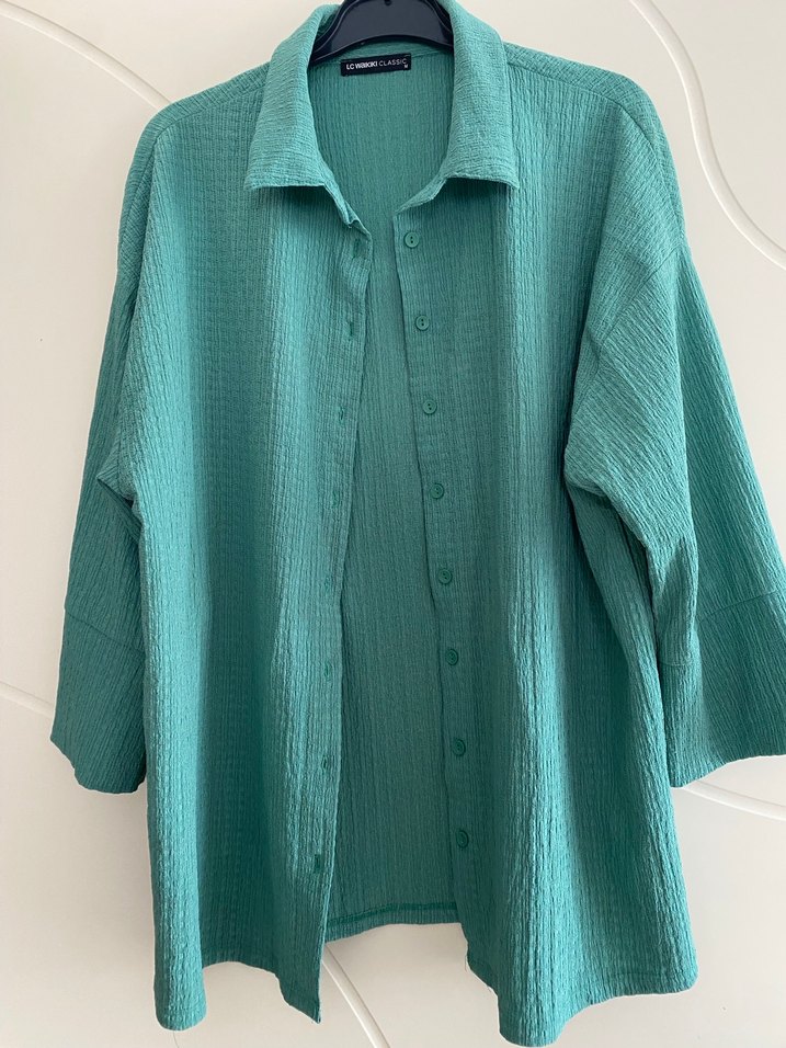 Bol kesim, uzun kollu turkuaz keten gömlek, çıtçıtlı ve yakalı, günlük kullanıma uygun bohem tarzda.