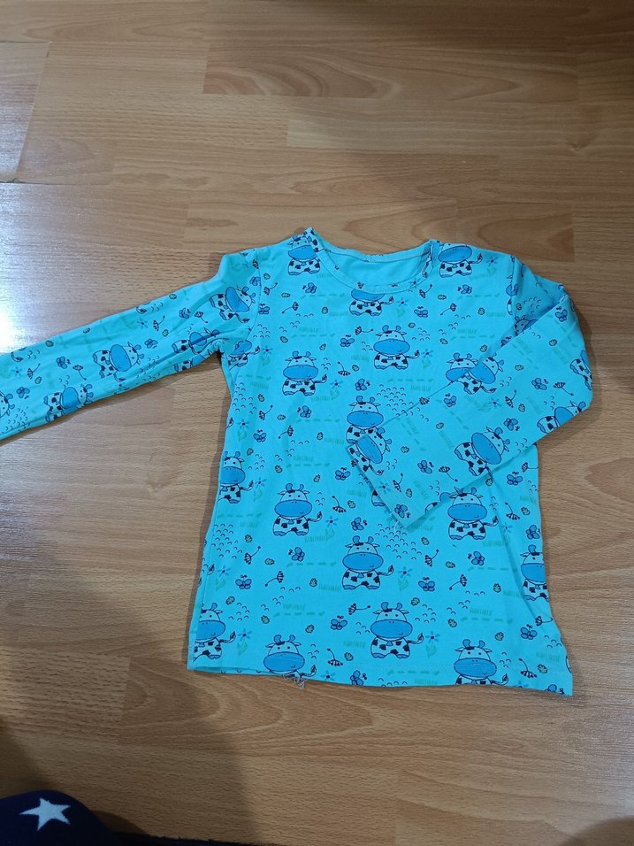 Uzun kollu, yuvarlak yakalı ve renkli baskılı desenlere sahip turkuaz kız çocuk tişörtü. Rahat kesim, yumuşak kumaştan üretilmiştir.