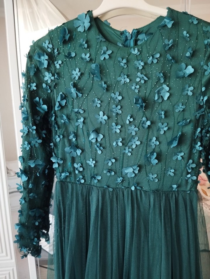 Uzun kollu, yuvarlak yakalı, işlemeli çiçek detayları ve drapeli kumaşıyla turkuaz renkte, bohem tarzda nişan elbisesi.