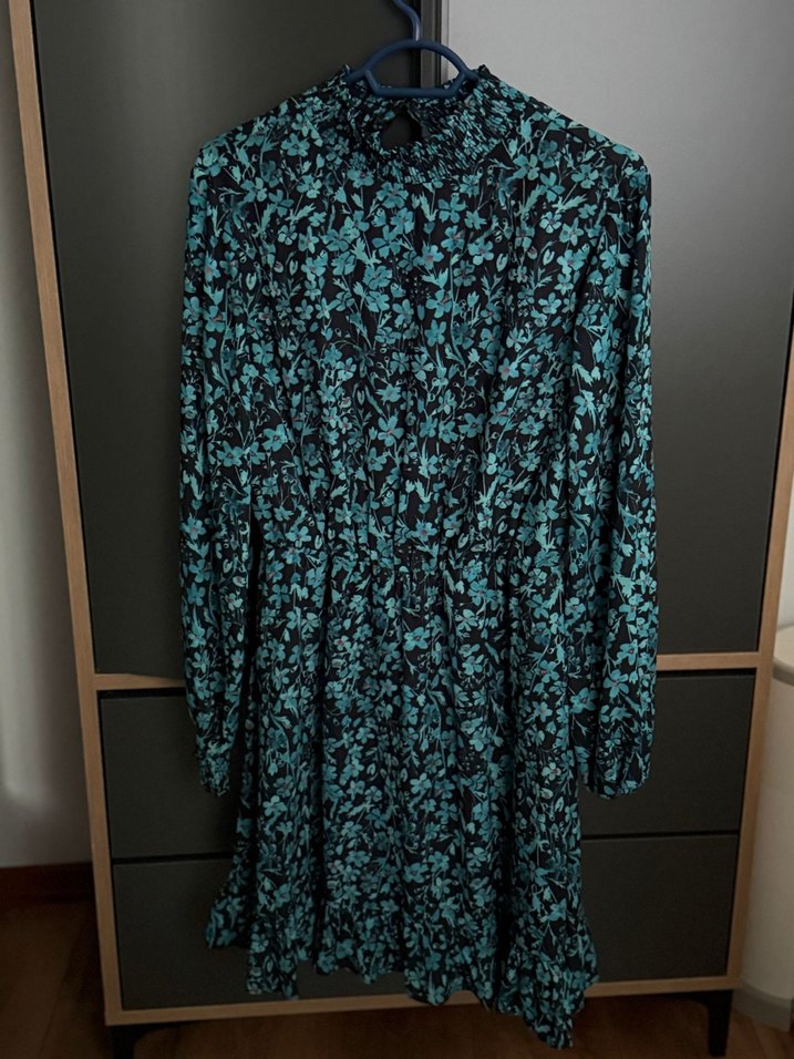 Uzun kollu, yüksek yakalı ve pilili tasarıma sahip bol kesim tunik, sentetik kumaştan yapılmış koyu turkuaz batik desenlidir.
