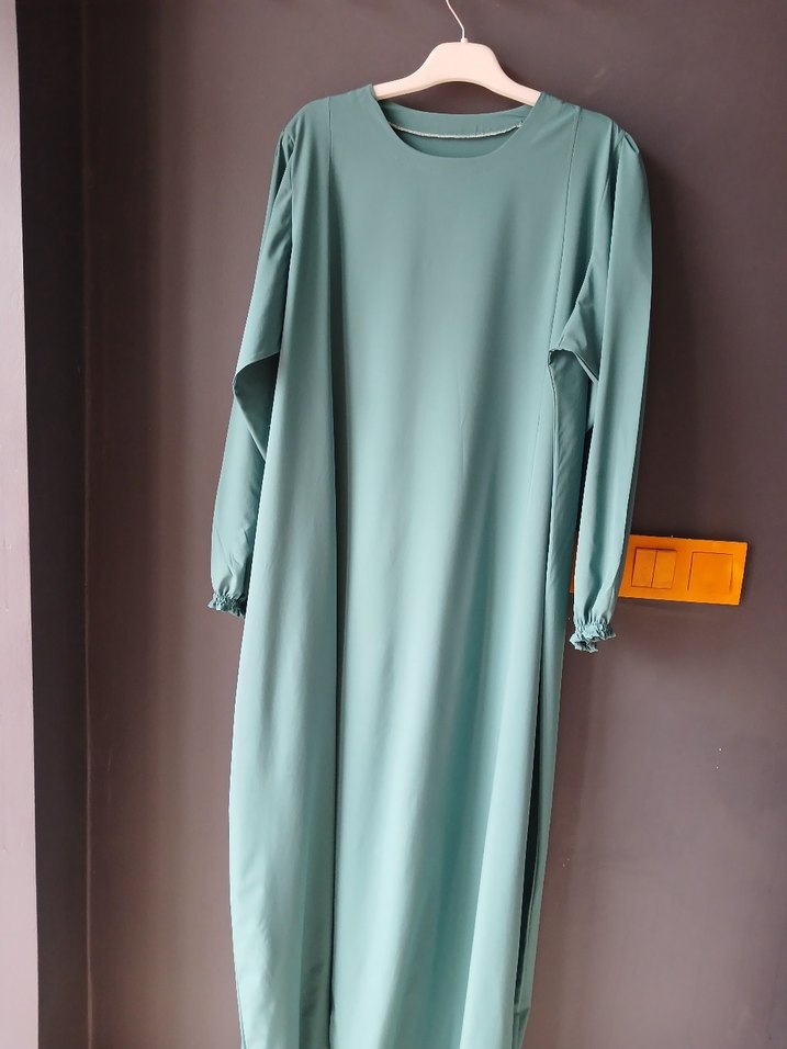 Uzun kollu, salaş kesim turkuaz elbise. Yumuşak sentetik kumaştan, yuvarlak yaka ve drapeli tasarıma sahiptir. Günlük kullanıma uygundur.