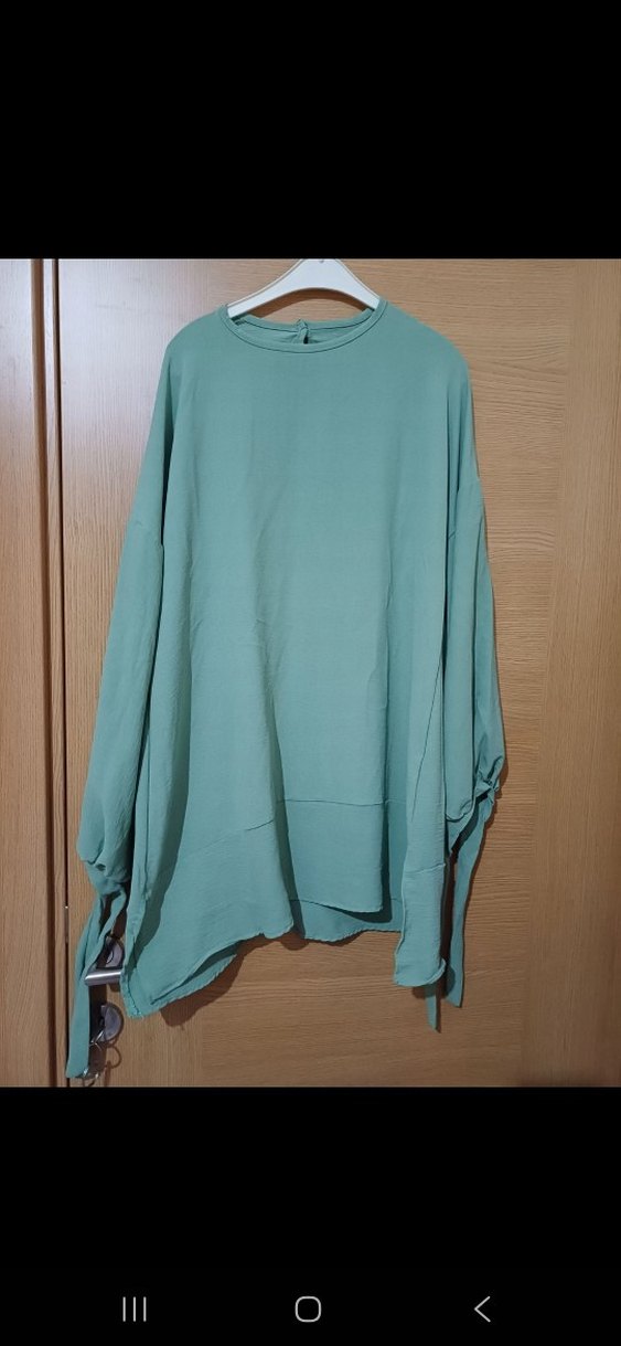 Uzun kollu, bisiklet yaka ve salaş drapeli kesime sahip turkuaz tunik. Uzun boyu ve sentetik yumuşak kumaşıyla gündelik sokak stiline uygun.