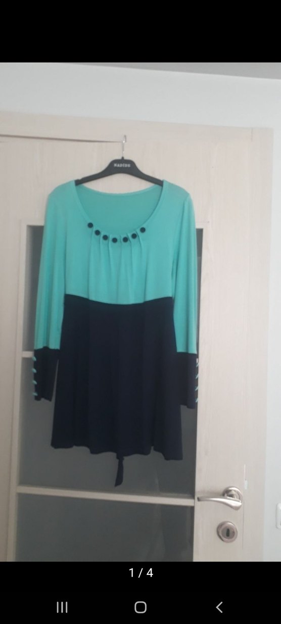 Uzun kollu, düğmeli detaylara sahip turkuaz ve siyah renklerde bol kesim tunik. Sentetik kumaştan üretilmiş, günlük kullanıma uygun rahat bir modeldir.