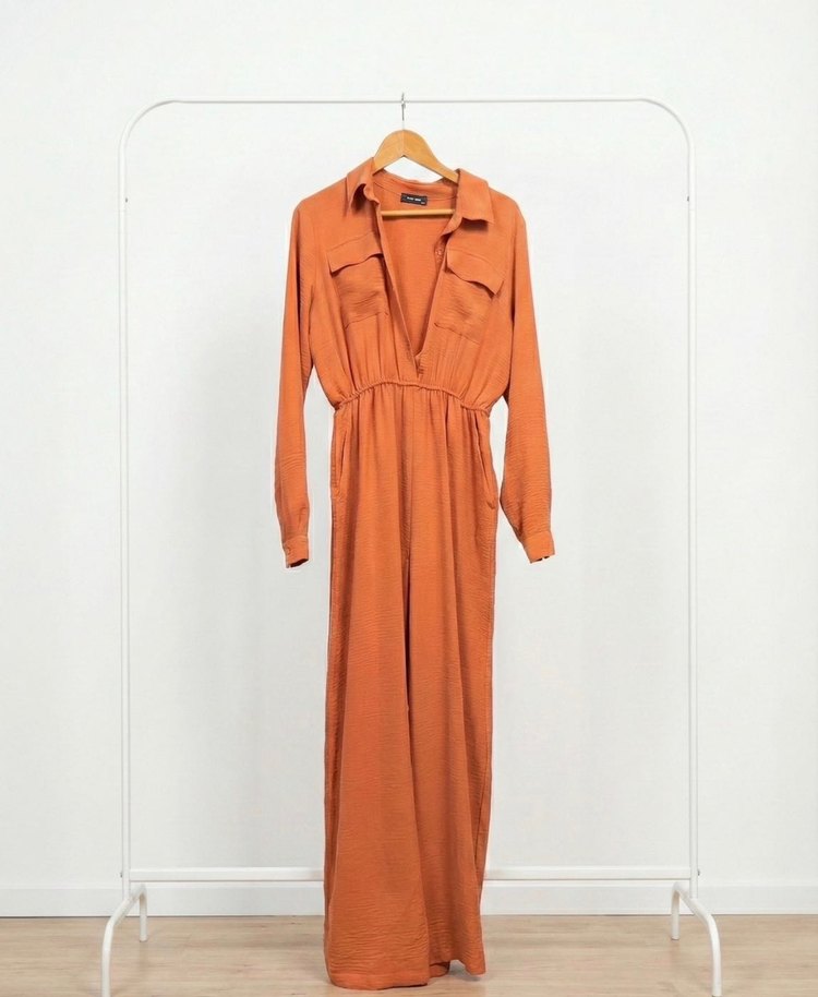 Uzun kollu ve notched lapel yakalı turuncu renkli kadın tulum , rahat kesim ve yumuşak kumaştan üretilmiştir. Günlük sokak stili için uygundur.
