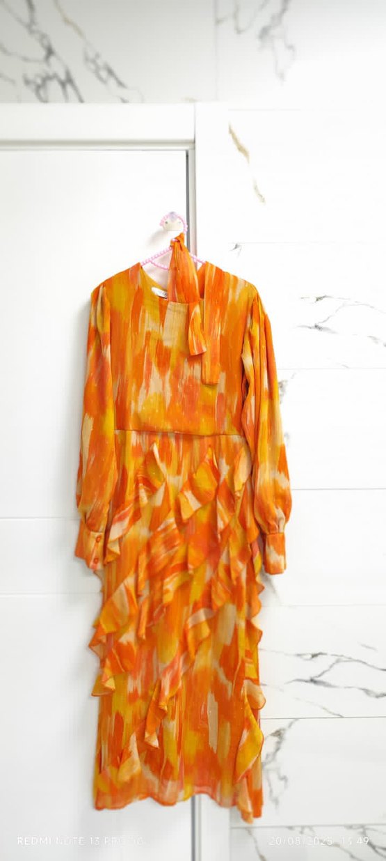 Renkli turuncu uzun elbise, yüksek yaka ve uzun kolludur. İpeksi kumaştan, fırfırlı ve batik desenlidir. Modern bir tarz sunar. Bir iki kere giyildi defosu yok