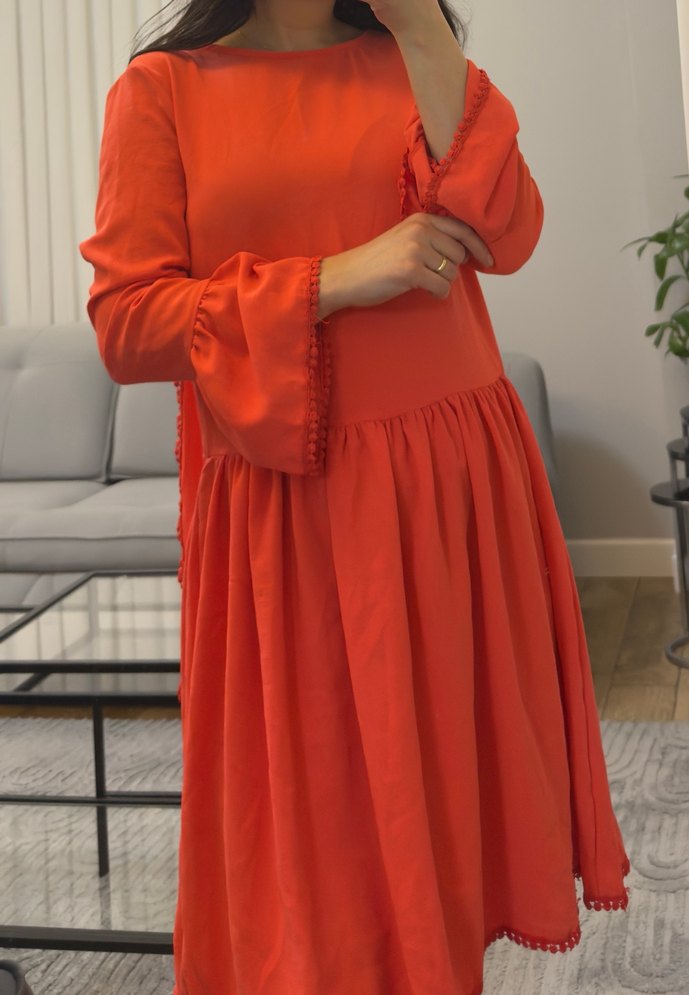 Turuncu, uzun kollu ve salaş kesim bohem elbise. İpek gibi kumaş, yuvarlak yaka, sırt ve kol ile etek uçlarında fırfır detayları bulunur. Ürün çok az kullanılmış olup hiçbir defosu yoktur.