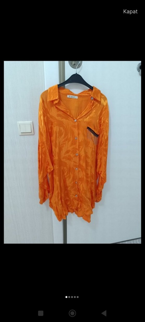 Uzun kollu, V yaka, turuncu parlak saten kumaştan yapılmış salaş kesim gömlek. Düğmeli ve hafif batik desenli, bohem stiline uygun günlük kullanıma uygun. L beden saten geniş sorunsuz gömlek. 2 kere giydim