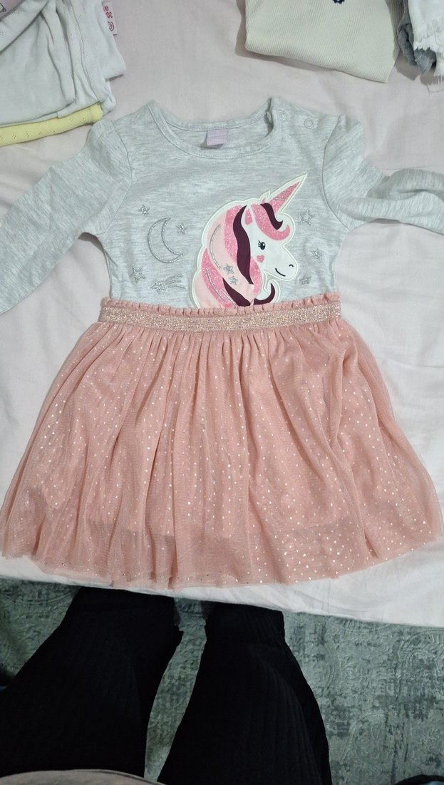 Uzun kollu, unicorn baskılı, fitted kız elbisesi. Pastel pembe, ışıltılı, fırfırlı etek kısmı ile şık ve rahat bir görünüm sunar.