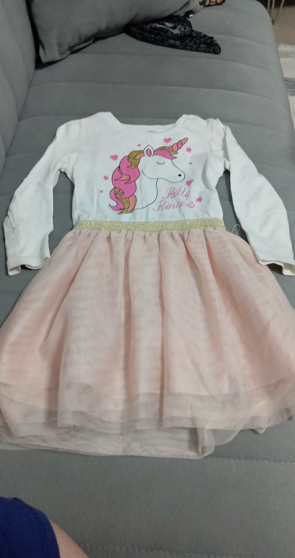Uzun kollu, bisiklet yaka ve baskılı unicorn desenli kız elbisesi. Pastel pembe, volanlı etek kısmı yumuşak sentetik kumaştandır. Trendy sokak stili için uygundur.