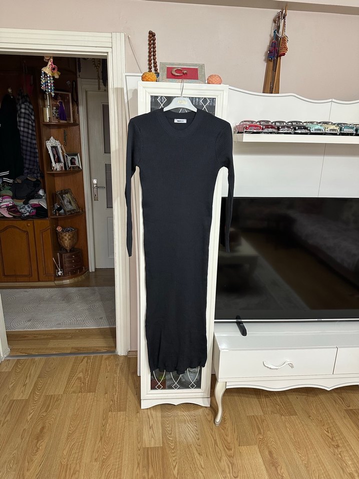 uzun elbise, yüksek yakalı ve uzun kolludur. Yırtmaç detayı, regular fit ve minimalist tarzı ile sentetik kumaştan üretilmiştir. Boyu 137