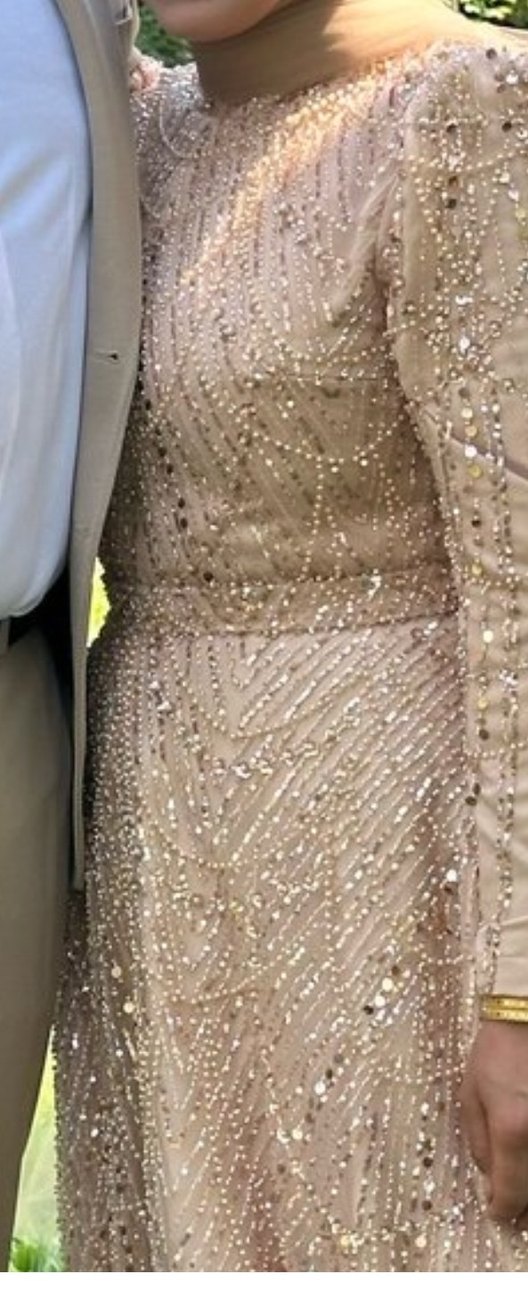 Bu uzun ve v yaka abiye elbise, bej payetli parlak kumaş, uzun kollu ve klasik bohem tarzıyla düğünler için uygundur. ✨sadece 1kez kullanıldı.