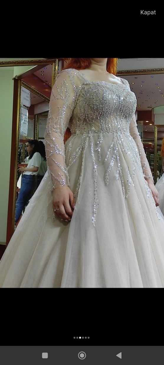Uzun boy, V yaka ve uzun kollu, ince kesim prenses gelinlik. Açık bej kumaş, ışıltılı detaylarla süslenmiş, klasik ve gösterişli tarzda.