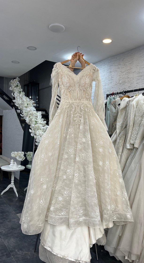 Uzun boy, V yakalı ve uzun kollu, vintage dokunuşlu modern klasik tarzda beyaz prenses gelinlik. Fitted kesim şıklık katıyor.