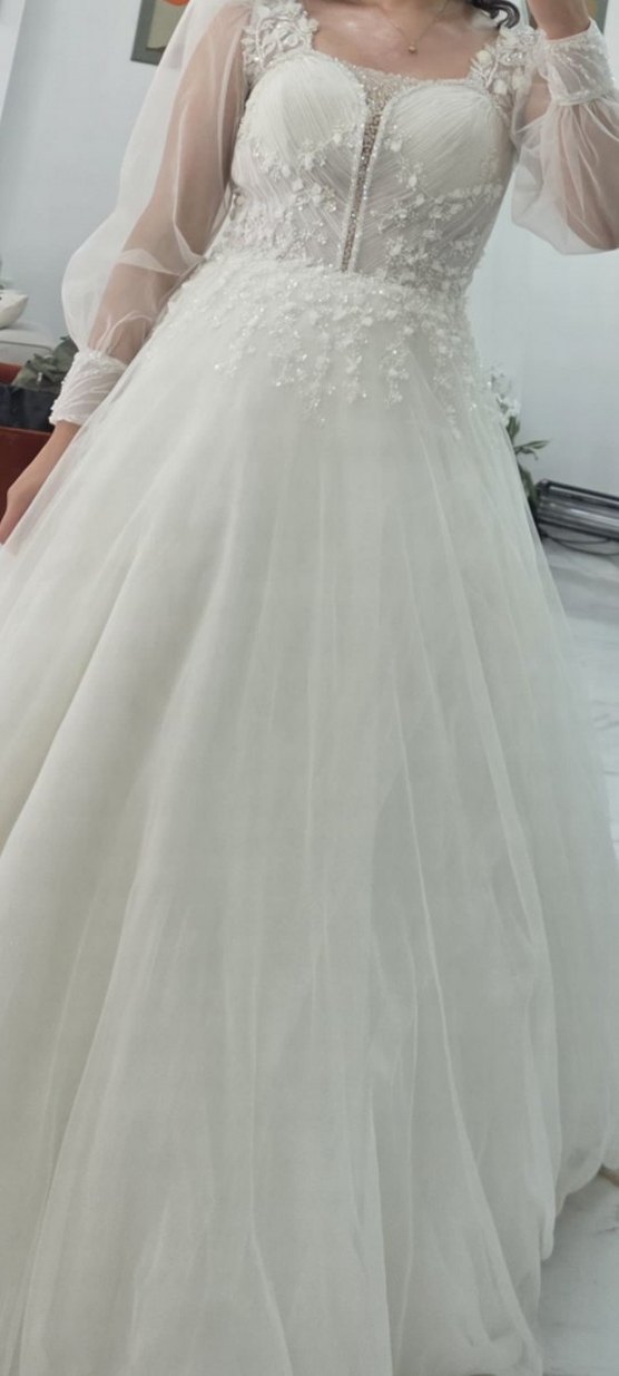 Uzun Kollu V Yaka Beyaz A Kesim Gelinlik