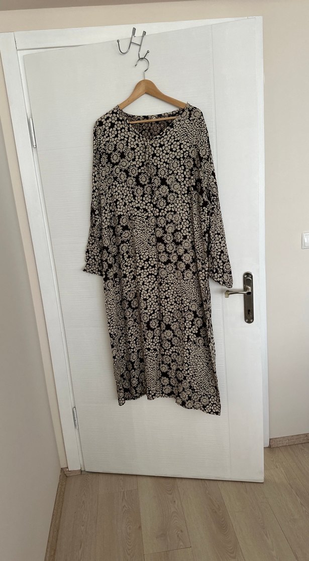 Uzun kollu, V yaka ve düğmeli, bol kesim bohem elbise. Gri ve bej tonlarında, ipeksi dokulu kumaştan, sade ve şık bir tasarım.