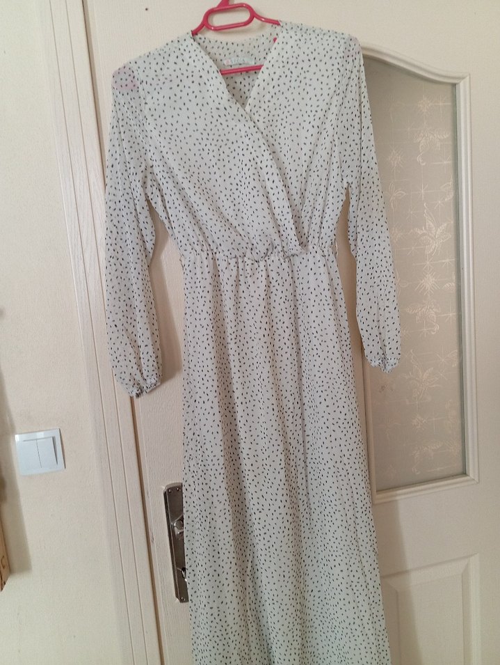 Uzun kollu, bol kesim bohem elbise, drapeli V yakaya sahiptir. Yumuşak sentetik kumaştan yapılmış, minimalist gri tasarımlıdır, günlük kullanım için uygundur.