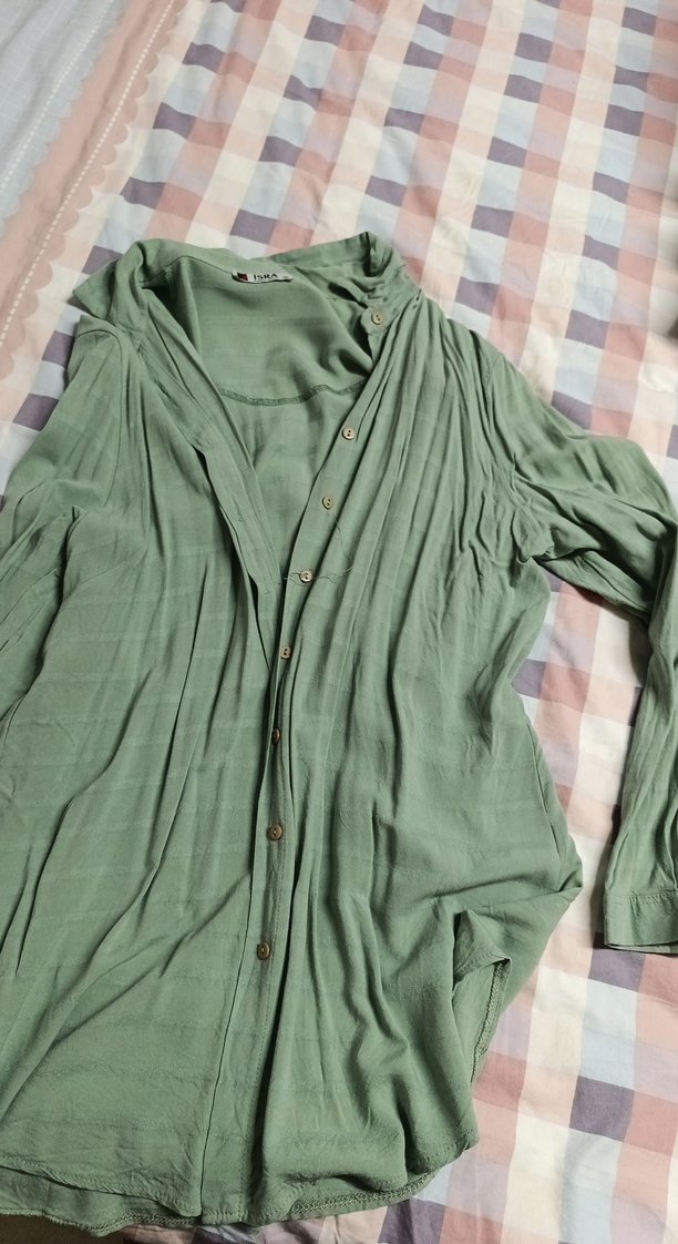 Pastel haki renkte, V yakalı, düğmeli ön kısmı olan bol kesim uzun kollu keten gömlek. Bohem tarzında, desensiz ve uzun boyda, günlük kullanım için uygun.