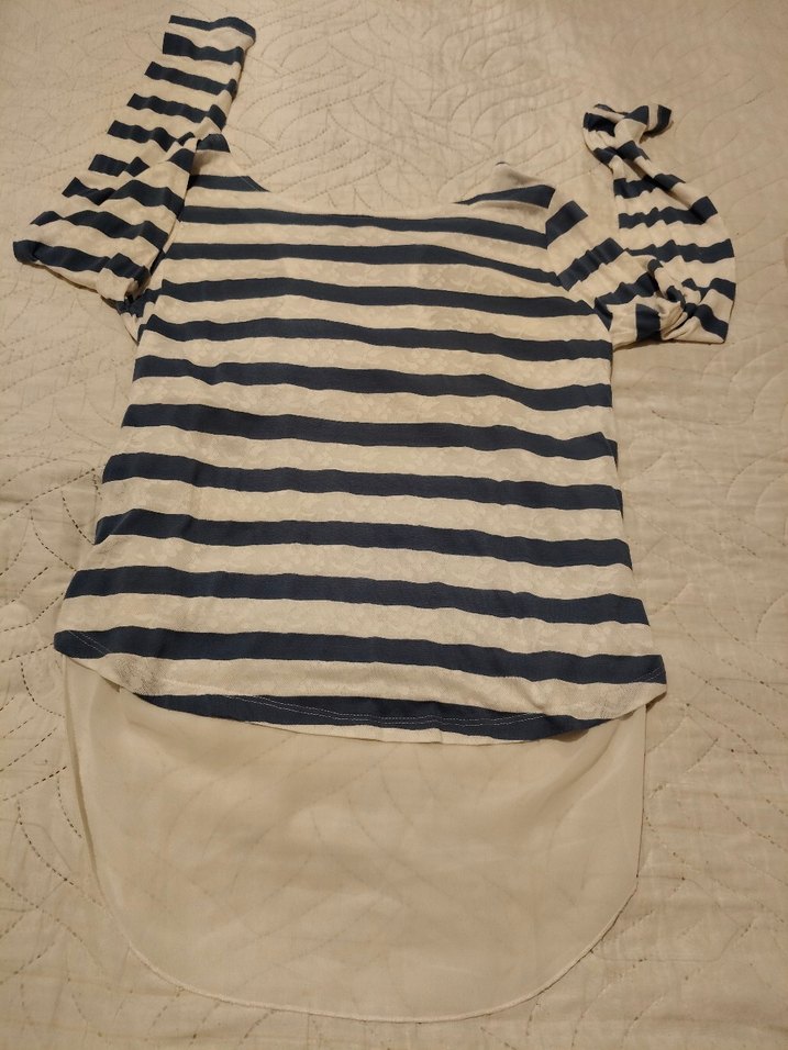 V yaka, uzun kollu, çizgili ve fırfırlı detaylı hamile üstü. Bej ve gri tonlarında, yumuşak sentetik kumaştan, günlük rahat sokak stili için uygun.