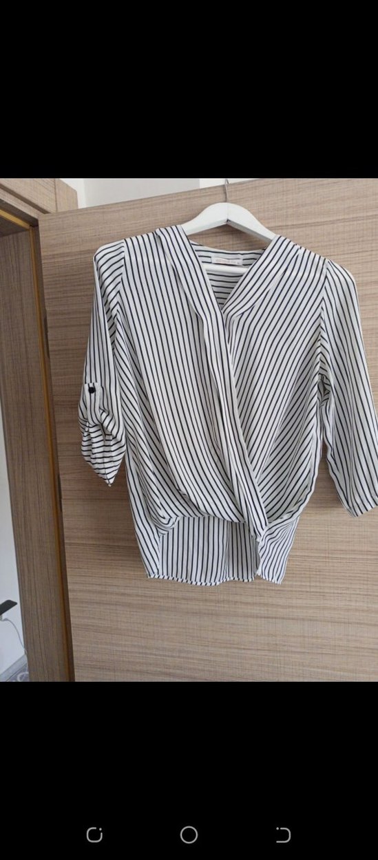 Uzun kollu, V yaka, pileli detaylı, beyaz zemin üzerine gri çizgili bol kesim kadın gömleği. Günlük kullanıma uygundur.