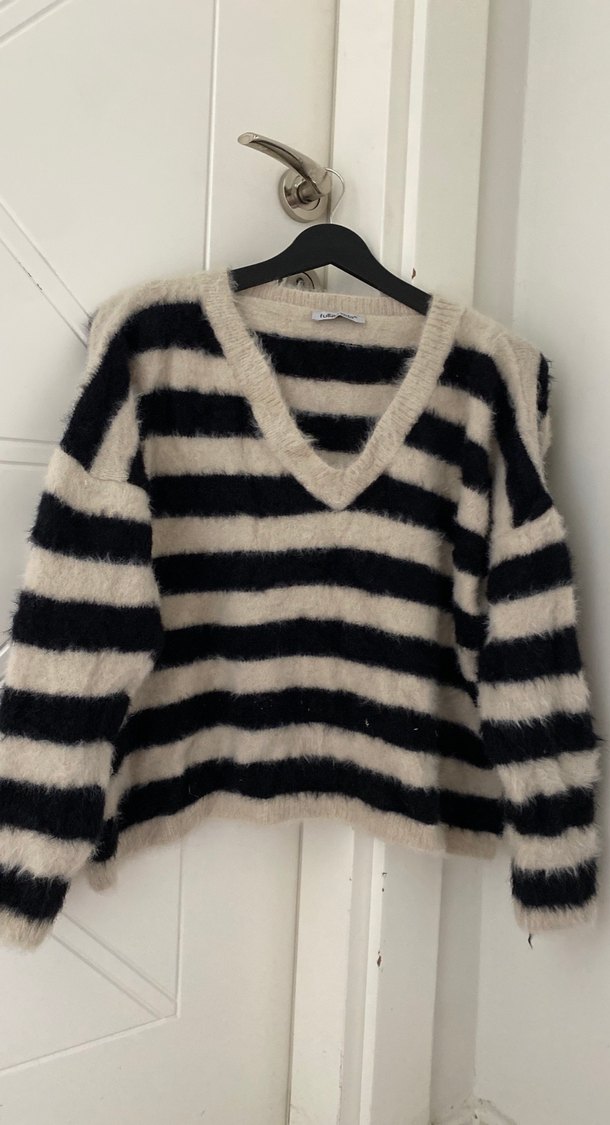 Uzun kollu, V yaka, çizgili örme yün kadın kazak. Gri tonlarında, normal midi boyda ve bol kesimdir, günlük rahat kullanım için uygundur.