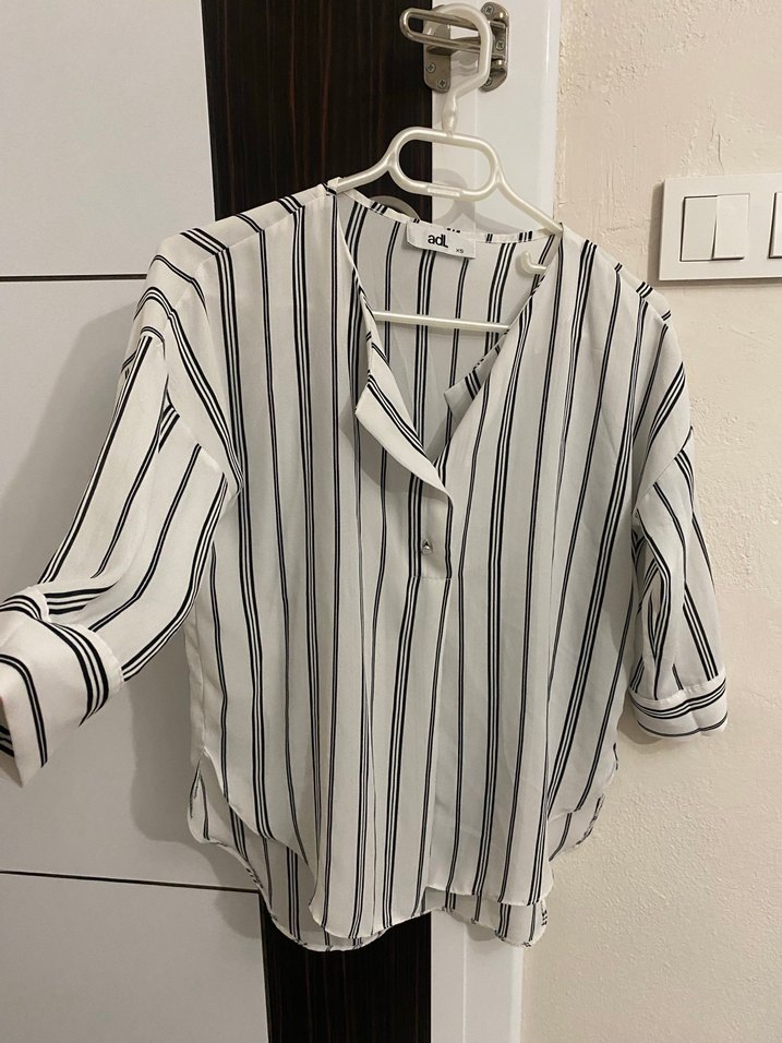 Pamuk kumaştan, uzun kollu, V yakalı ve düğmeli kadın gömlek. Gri ve beyaz dikey çizgili, rahat kesim. Günlük sokak tarzı için uygundur.