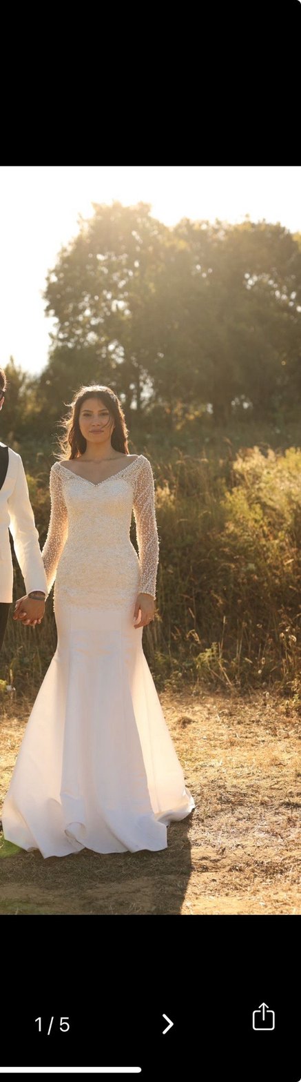 Özel tasarım , seyyar kuyruğu da var.Uzun kollu, V yaka beyaz denizkızı gelinlik, modern klasik ve minimalist tasarımla zamansız şıklık sunar.