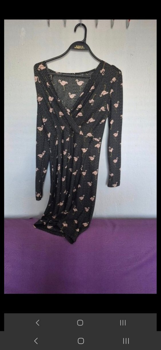 Uzun kollu, V yaka, fit kesim hamile geceliği, koyu gri renkte ve flamingo desenli, uzun boyda rahat kullanım sağlar.