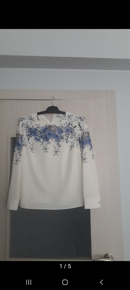 Uzun kollu, V yakalı ve düğmeli kadın bluz. Beyaz renkte, gri baskılı çiçek desenli, ofis için uygun sentetik kumaştan üretilmiştir.