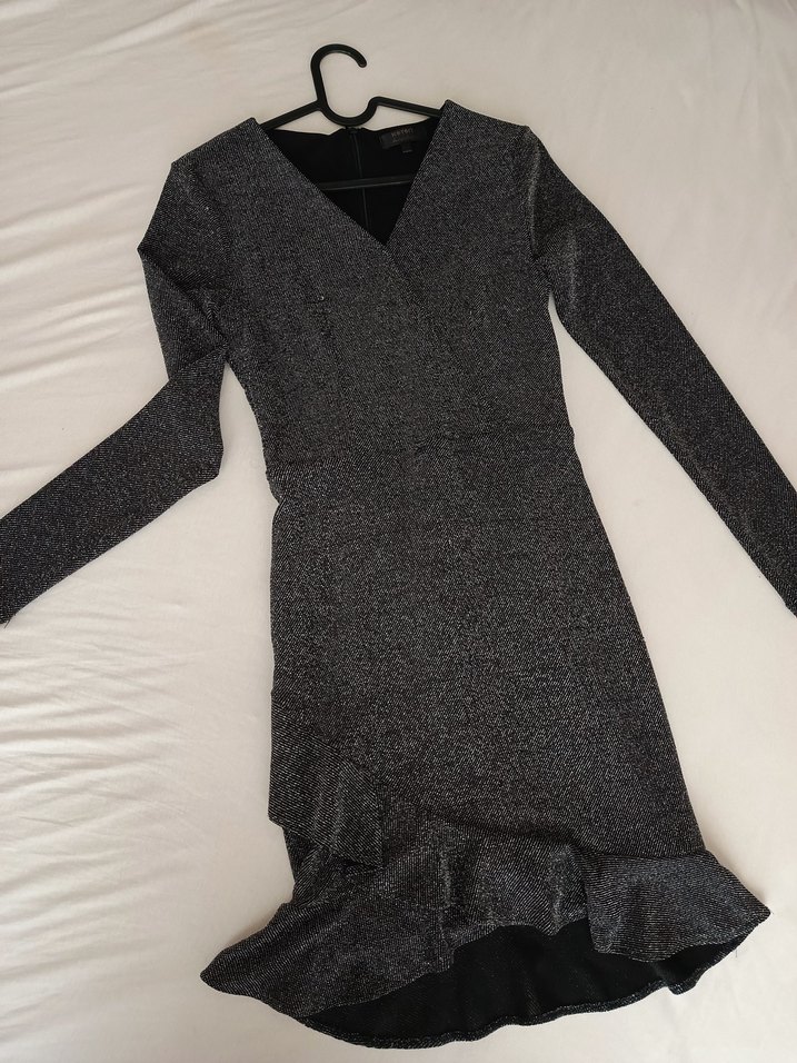 V yaka, uzun kollu, drapeli detaylı ve asimetrik etek uçlu, vücuda oturan uzun abiye elbise. Koyu gri rengiyle gotik ve şık bir görünüm sunar. simli görünüm XS-S esnek oturan kumaş m beden de uygun
