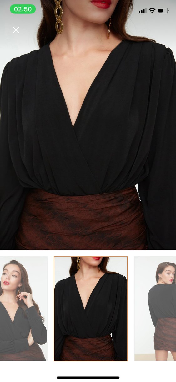 Bu kadın bluz, derin V yaka ve uzun kollu, ipeksi kumaştan drapeli tasarıma sahip. Koyu tonlarda, cesur goth tarzıyla iş ortamına uygun.