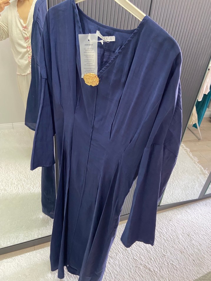 #TesettürelbiseUzun boy, drapeli tasarıma sahip mavi elbise. V yaka ve uzun kollu, bol kesimli, desensiz, ofis için uygun.
