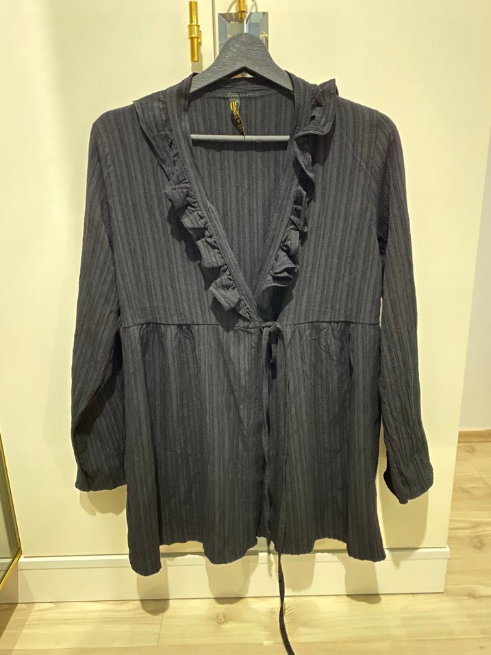 Yumuşak keten kumaştan, V yaka ve fırfırlı detaylı, uzun kollu bol kesim Siyah renk ince batik desenli, bohem Paris tarzı günlük kullanıma uygun.