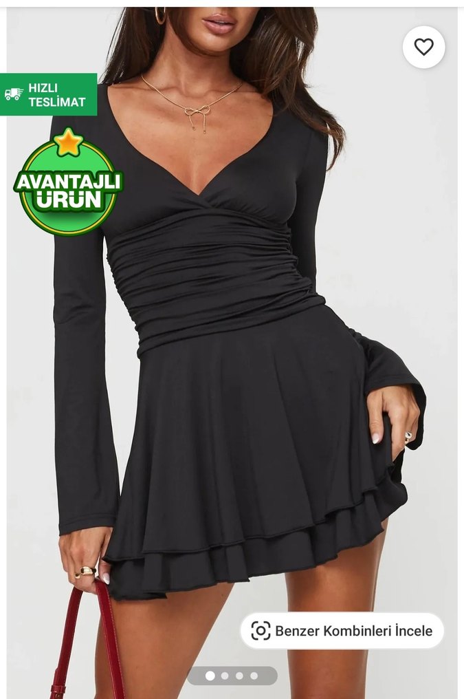 V yakalı ve uzun kollu, belden oturan siyah mini elbise. Kat kat fırfır detaylarıyla hareket kazanan, sentetik yumuşak kumaştan üretilmiştir. Cesur ve şehirli tarz için uygundur. ✨