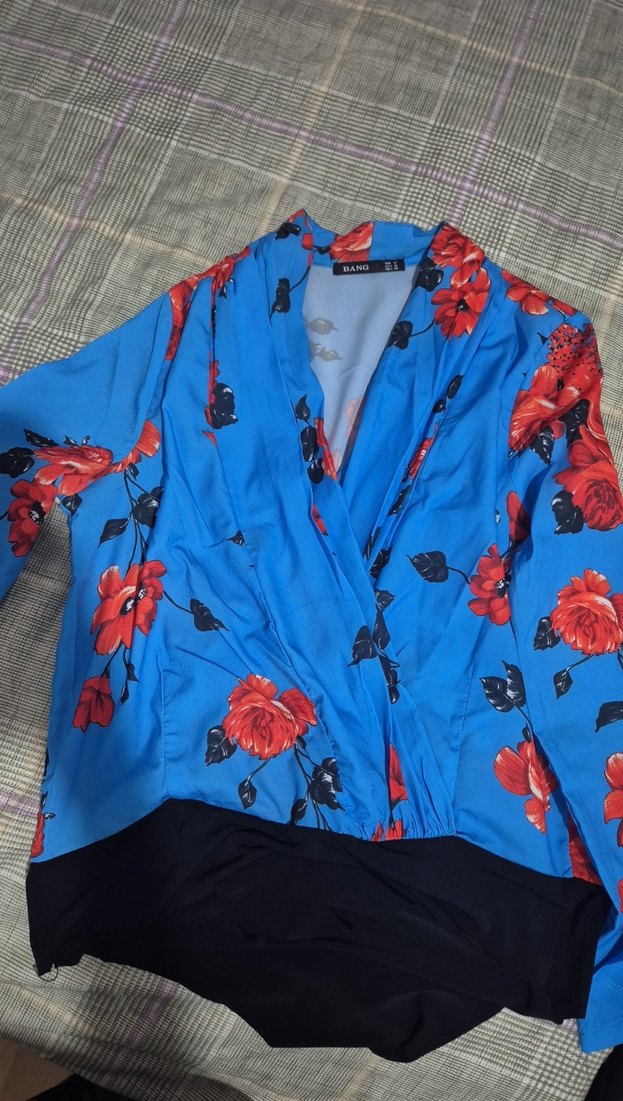 Mavi renkli, V yakalı ve uzun kollu bluz. Rahat kesimli ve drapeli tasarımı, çiçek desenli baskısıyla günlük sokak stiline uygundur.