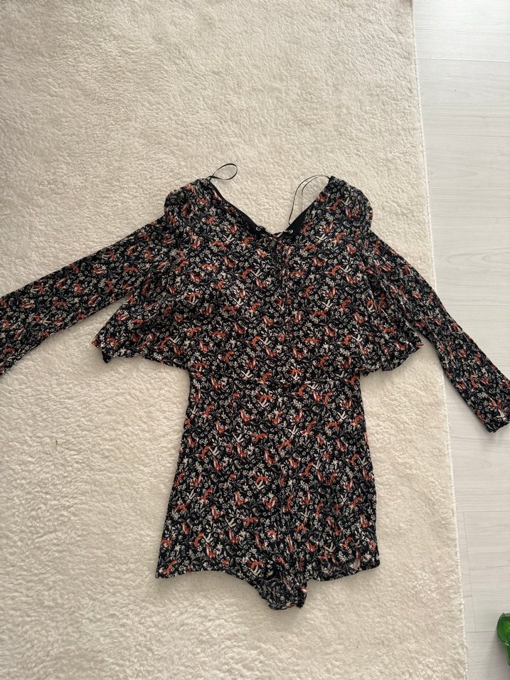 Uzun kollu ve V yakalı kadın mini tulum, çok renkli batik desenli, sentetik yumuşak kumaştan ve fırfır detaylıdır. Bol kesim ve bohem tarzda, günlük kullanıma uygundur.