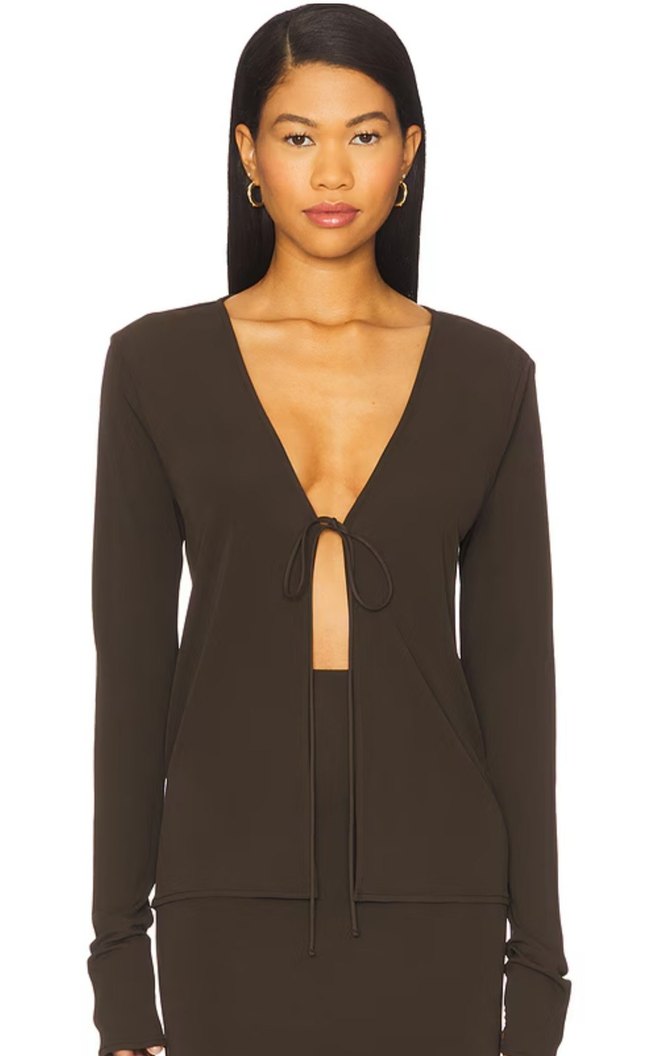 Fitted kesim, derin V yakalı ve uzun kollu bu kadın bluz, ipeksi dokusuyla dikkat çeker. Koyu kahverengi rengi ve minimal tasarımıyla romantik akşamlar için zahmetsiz şıklık sunar. Uzun boyu ve desensiz yapısıyla çağdaş bir stile sahiptir. ✨