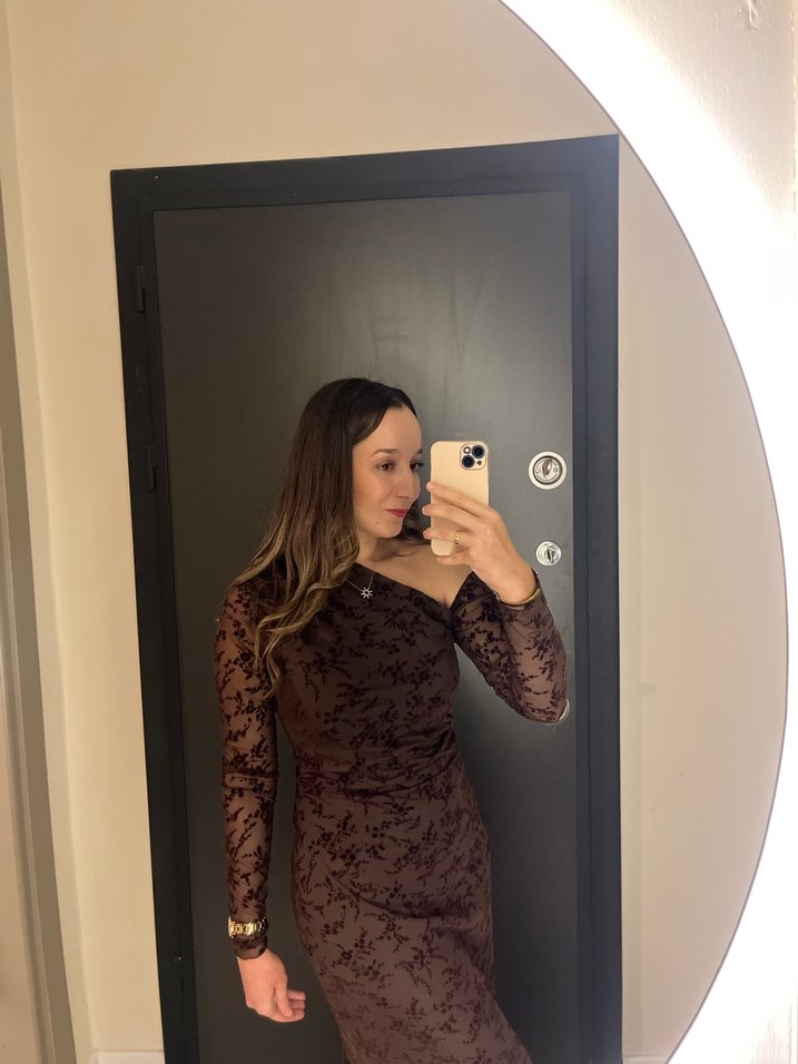Kahverengi, uzun kollu transparan detaylı, V yaka ve midi boyda, gövdeyi saran tasarıma sahip elbise. Cesur ve göz alıcı bir görünüm sunar.