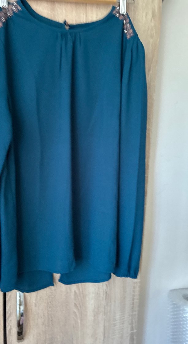 Bu koyu mavi bluz, uzun kollu ve V yakalıdır. Dökümlü, bol kesimi ve yumuşak sentetik kumaşı ile minimalist, çağdaş bir tarz sunar. Ofis için uygundur.