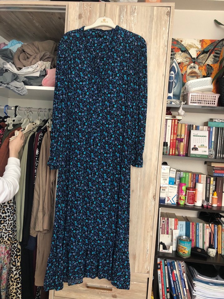 Mavi bohem uzun elbise, uzun kollu ve V yakalıdır. Sentetik kumaştan olup, dökümlü ve koyu tonlarda batik desenlidir, günlük kullanıma uygundur. Vintage elbise 36/38 beden çok şık