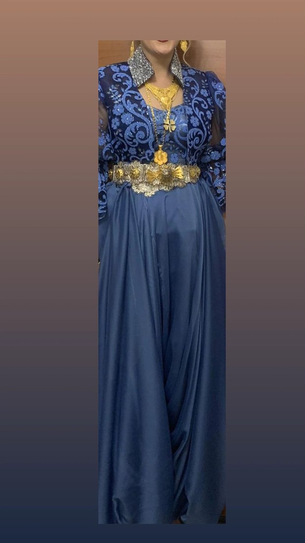 Uzun kollu, V yakalı koyu mavi drapeli desenli Boşnak şalvarı. Normal kesim 2 kez giyinildi. kınalar için uygundur. kemer dahil değildir.