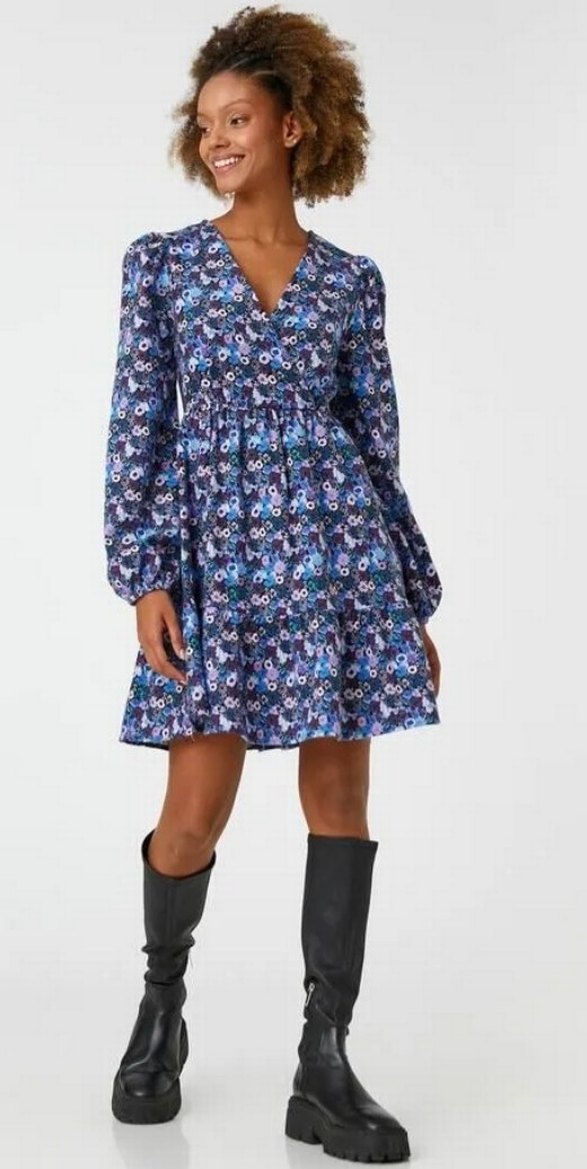 Mor renkli midi elbise, uzun kollu ve V yaka tasarıma sahiptir. Rahat kesimli ve fırfır detaylıdır. Koyu tonlarda batik desenlidir, yumuşak sentetik kumaştan üretilmiştir.