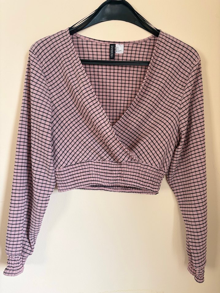 Bu dar kesim bluz, uzun kollu, V yaka ve pileli tasarımıyla koyu pembe batik desene sahip Temiz defosuz bir kez giyildi h&m ürünüdür s beden
