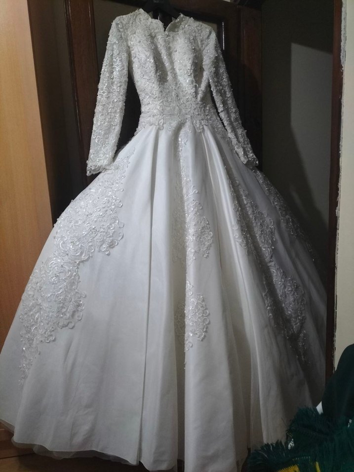 Parlak kumaştan uzun kollu ve V yakalı klasik beyaz prenses gelinlik. Düzenli kesim ve uzun boyda, geleneksel düğünler için uygun.